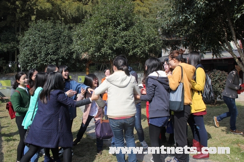 大家先在一个大草坪上休憩片刻,随后玩起了“五毛一块”的游戏。男生做五毛,女生做一块。主持人喊:六块五,那么必须牵手或者搭肩围成一个圈。可以是6个女生与1个男生的组合,也可以是5个女生与3个男生的组合。由于编辑部男生少,于是主持人又想出一个更好的方案,戴眼镜的算五毛,不戴眼镜的算一块,同时,戴眼镜的又可灵活变动,摘下戴上,以免凑不齐或数量过多的出现。最后,令大家意想不到的是往往最后获胜的两位,还一起表演节目。玩伴们直呼过瘾,却也大呼上当,赢或者不赢都显得好难。