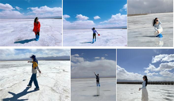 丝绸般轻柔的水面,浸润着洁白的盐层,风吹过,波光粼粼,如烟如雾。漫步于拥有“中国天空之镜”之称的茶卡盐湖,好似身处苍穹,不知道踩着的是湖水中洁白的盐,还是天空上洁白的云。