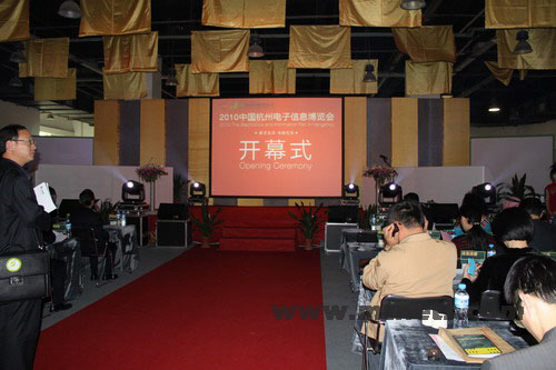 29日下午,2010中国杭州电子信息博览会开幕式在海报机器人热舞表演中隆重揭开,省委常委、市委书记黄坤明为本届展会发来贺信。国家工业和信息化部总经济师周子学,商务部外贸发展事务局副局长贾国勇,国家金卡工程协调领导小组办公室主任张琪,副市长佟桂莉,省、市有关部门以及中国台湾区电机电子工业同业公会负责人一起出席了开幕式。明通科技等众多杭州知名电子商务企业受邀参加了开幕式,共同见证电子信息博览会的精彩一刻。