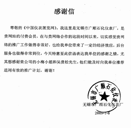 无锡市广顺石化仪表厂在中国仪表展览网的服务下,开展网络推广营销,为企业产品销售和渠道拓展起到了切实的推动作用。广顺石化仪表特意传来感谢信,表达了对中国仪表展览网和相关工作人员的赞赏和感谢。