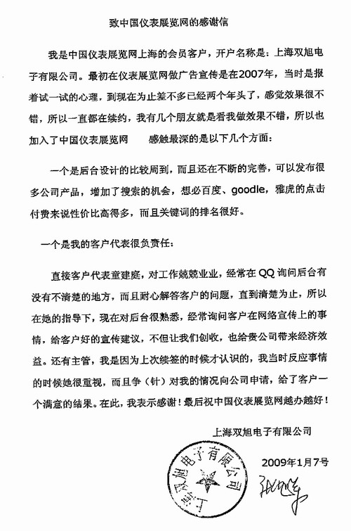 近2年的网络营销和网络推广给双旭在市场营销上产生了良好的推动作用。中国仪表展览网的优质服务和实效推广更吸引了双旭合作伙伴的关注,他们纷纷投入这个专业的行业平台,宣传产品,宣传企业,宣传品牌,成为为仪表企业双赢合作的权威平台。在这样的专业网络平台上宣传,自然能准确抓住有效客户,事半功倍!