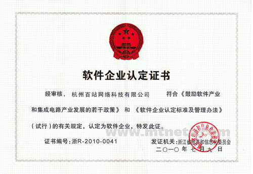百站网络致力于行业网站开发运营和企业电子商务解决方案服务,始终坚持核心技术的自主研发和服务软件创新提升。此次认证审批,是根据《软件企业认定标准及管理办法》和《软件产品管理办法》的有关规定,由软件行业协会受理、初审,市科技和信息局、市发展和改革局、市贸易工业局、市国家税务局组成的联审,经浙江省信息产业厅最终通过,授予杭州百站网络科技有限公司双软企业认证。