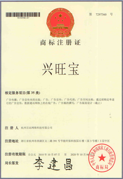 明通子公司百站网络的注册商标为“兴旺宝”,由旗下24大行业网站共同使用,核定服务项目为第35类,具体包括广告传播;广告宣传本的出版;广告;广告宣传;广告代理;广告空间出租;通过邮购订单进行的广告宣传;数据通讯网络上的在线广告;广告稿的撰写;广告版面设计等服务项目。