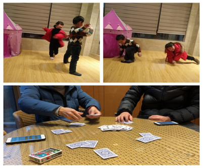 午休时间,宝贝们和大人们分成两派,各自开启娱乐耍玩。这不,哥哥教妹妹在房间榻榻米上练武,打拳,那妹妹呢?难道是看了十分火热的《这就是街舞》节目之后,想要教哥哥breaking(地板舞),哈哈!而大人们摒弃低头玩手机,集体打起了牌。一边是孩童们自成一体表演,另一边是大人们嗨起的牌场,好不热闹......